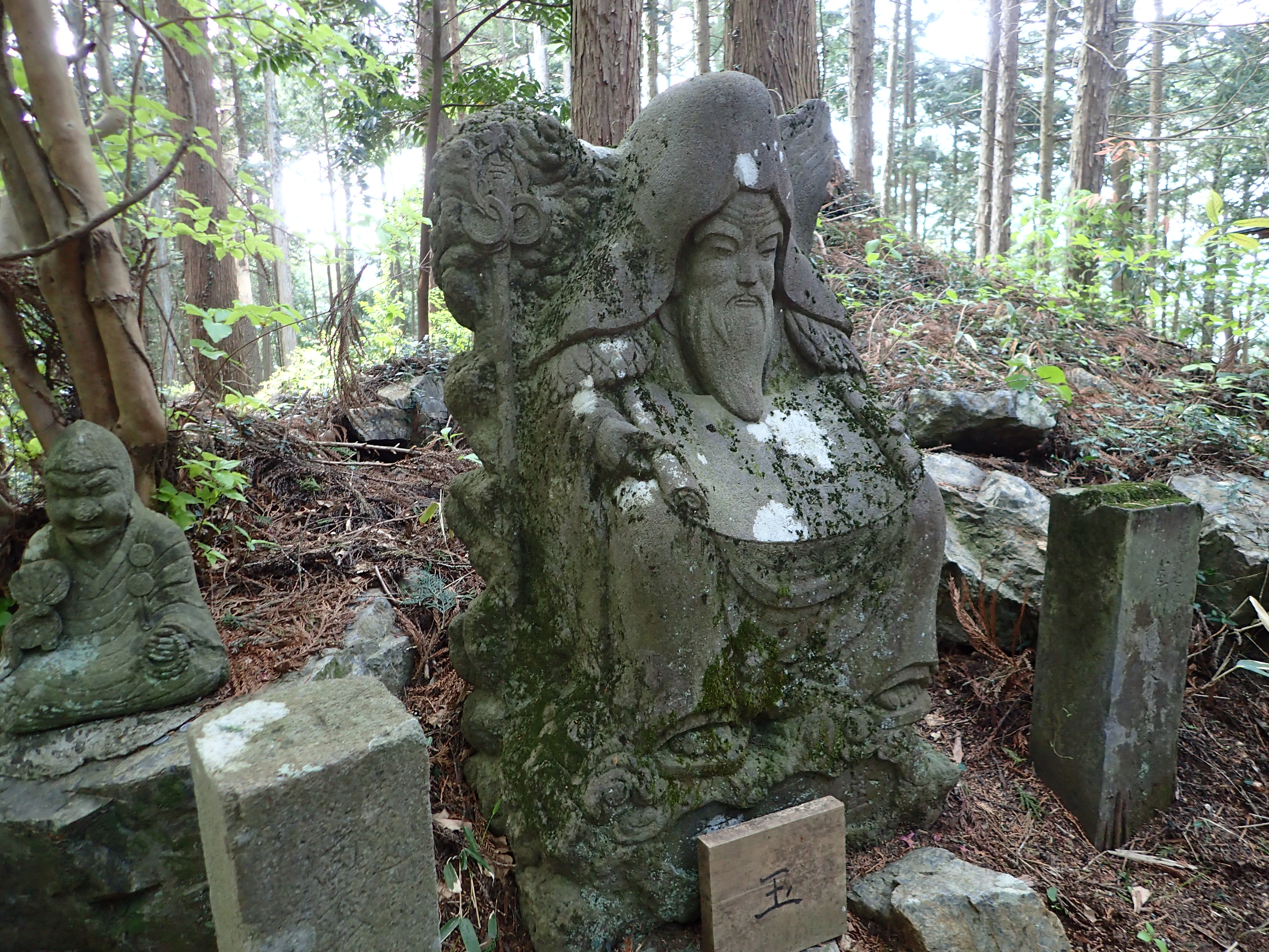 | 愛宕山(584m)…東京都青梅市柚木町1。(2016/05) 【参照:山歩き「日の出山」】 愛宕神社奥宮の左手の小高いところに、役行者のどっしりとした石像が祀られている。両手で経巻を開いている倚像で、極めて珍しい。錫杖は右手の後ろに立てかけられている。台座には「埜(玉)村」、背面には「慶應元乙丑年(1865)十一月/施主埜村勝右エ門」と銘が刻まれている。堂々とした様子の役行者像は、よく見られるような痩身ではなく、また落ち着いた、そして円熟した表情をしており、安心感を与える。 下って行くと、例えば「十六丁目/二俣尾/平岡惣吉」「慶應二寅六月日」というように、町石が現れる。また山内新四国霊場のりっぱな石塔が祀られていて、台座に「玉」と銘が刻まれたものもみられる。役行者の台座の「玉」と同じものである。 麓には愛宕神社があり、また真言宗豊山派の愛宕山明王院即清寺(東京都青梅市柚木町1-4-1)もある。愛宕神社奥宮、町石などは、愛宕神社と関係するものであり、役行者、山内新四国霊場などは即清寺と関係するものであろう。【写真7】 |