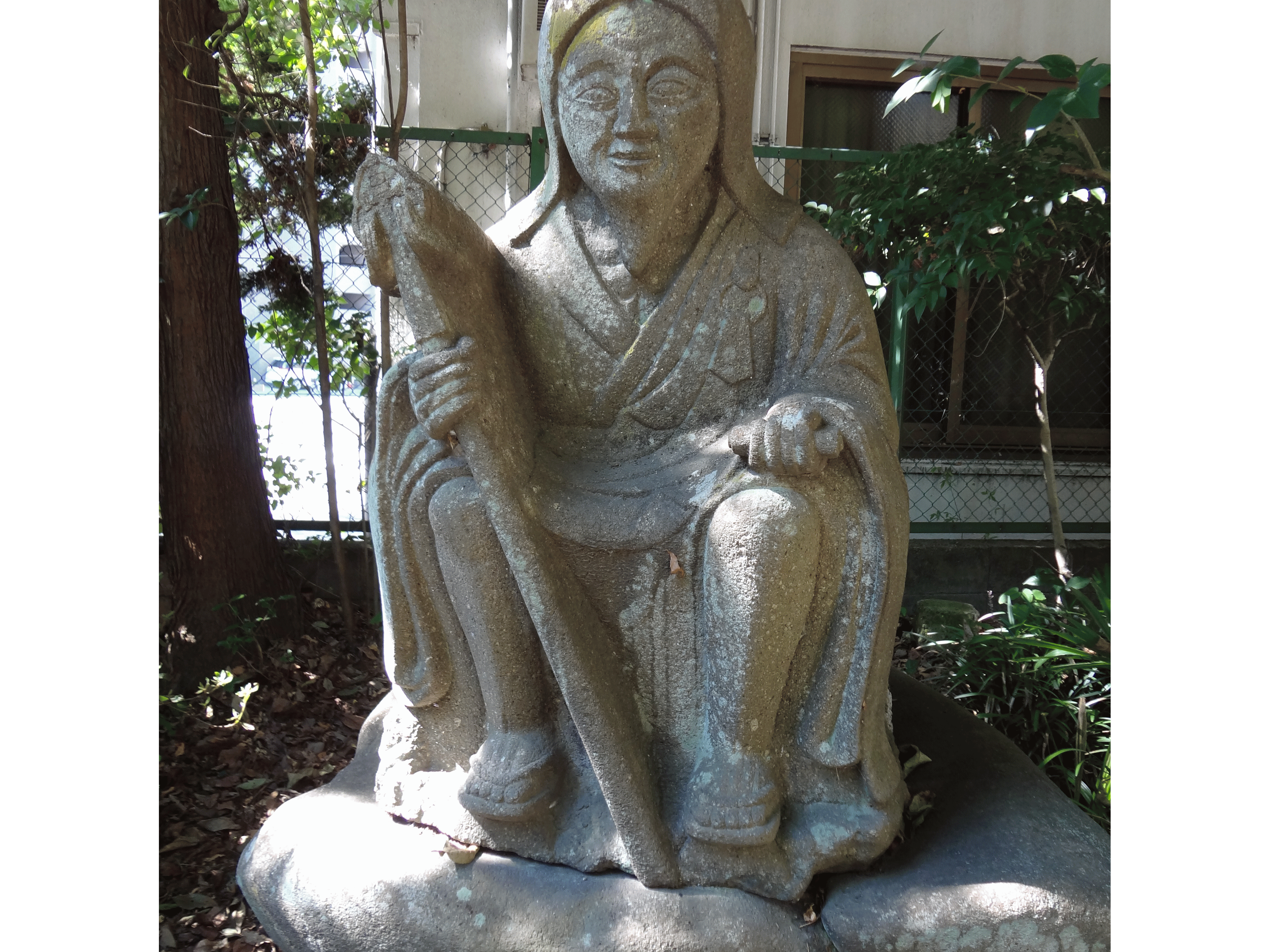 | Ⅰ 馬上蛎崎神社…仙台市青葉区片平1-2-18。良覚院跡。 「蛎」(かき)と記した漢字は、案内板では「蛎」の右に「力」が 加わったものである。 良覚院丁公園の一角に馬上蛎崎神社がある。神社の鳥居をくぐると、左手に丸彫りの役行者、前鬼、後鬼の石像が祀られている。役行者の石像は、右手に錫杖、左手に経巻を持った倚像である。若々しい丸みを帯びた顔の役行者は、品がよく、慈悲深い表情をしている。【写真】(2011/09) 役行者像前の石碑(株式会社間組仙台支店が昭和四十二年に建てたもの)には、次のように説明がされている。 平安朝の初め頃天台・真言二宗の密教と我国固有の山岳信仰が結びついて修験道という宗教が起った。その行者を験者または客僧とも山伏ともいゝ高き霊山に参龍修行した。平安朝末期頃からは当山派と本山派に分れて栄えさらに諸国を自由に巡行する特権をもっていたので軍事にも政治にも関与したが平時は祈祷に従事した。仙台藩の山伏は現在の良覚院丁公園内にあった良覚院が、総触頭で町名も之に因んでいる。この石像は修験道の開祖役小角で役行者ともいゝ、奈良朝の頃大和葛城山に苦行し霊験を得たという。後に神変大菩薩の勅号を贈られ人々に深く信仰された。前鬼後鬼と共に、もと良覚院に安置されていたものである |