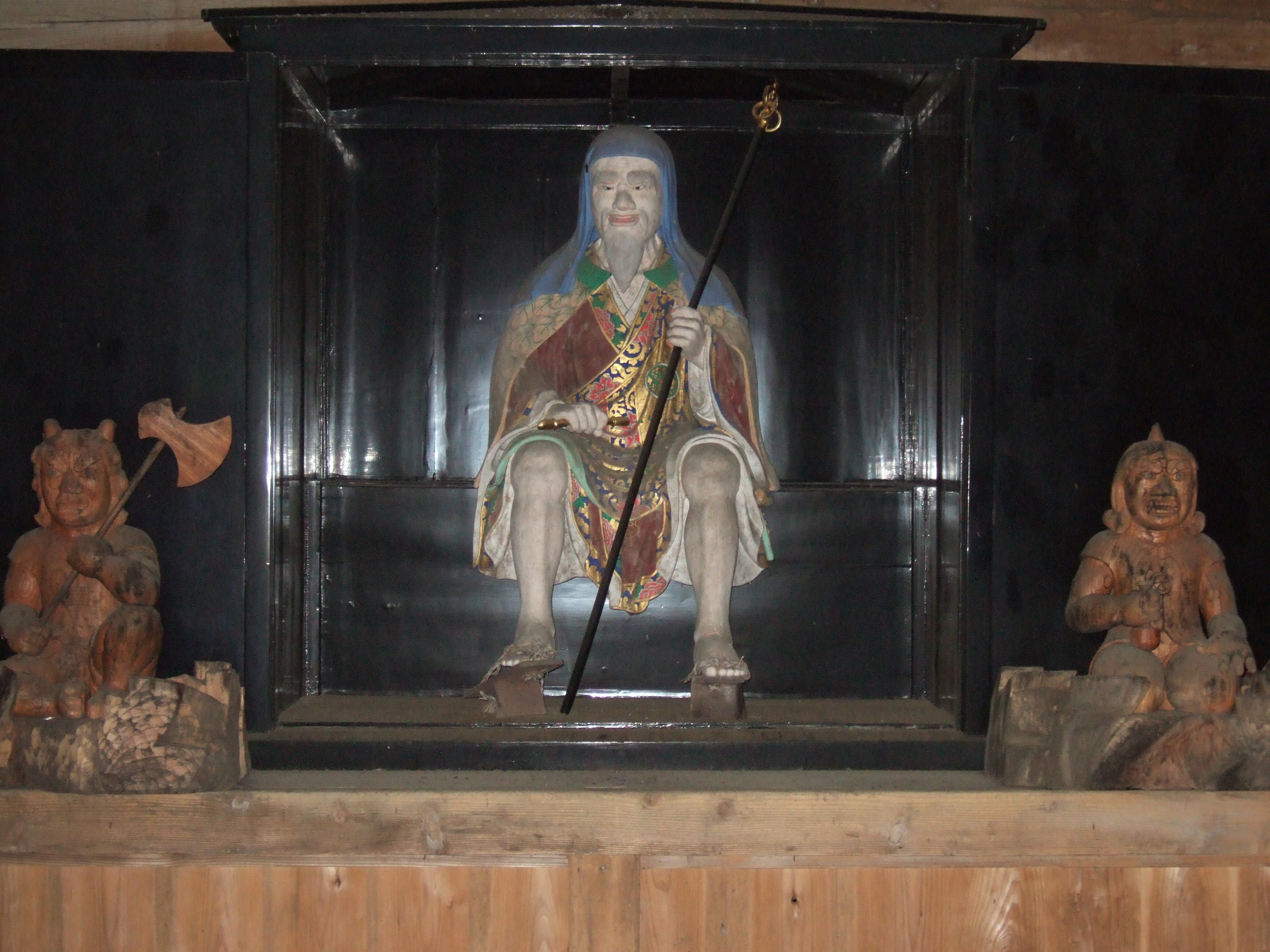 | Ⅰ 輪王寺役行者堂…栃木県日光市山内。(2007/08) 女峰山の登山口にある。大きな行者堂で、平成四年に彩色を新たにした役行者、前鬼、後鬼の木像が祀られている。右手に独鈷杵、左手に錫杖を持つ倚像である。【写真】 また日光山輪王寺の宝物殿には、「板絵着色役行者八大童子像」、「日光山縁起」が納められているという。 行者堂の説明板は以下の通りである。 行者堂(県指定文化財) 本尊は奈良時代の山岳呪術者、修験道の祖、役小角、役行者が非常に健脚であったので、足が丈夫になるようにとの信仰があり、草鞋の奉納が多い。ここは女峰山へ向かう登山口で、峰修行の行者の拝所でもあった。堂の創立は年代は不明であるが、天正十三年(一五八五)に再建したという記録がある。 現在の堂は、平成二年に改装され、同四年に彩色を新たにした役小角の木像と前鬼、後鬼が祀られた。 同所にある「栃木県教育委員会 日光市教育委員会」の「輪王寺行者堂」の説明では「……現在の建物は輪王寺明細帳によると天正三年(1575年)桜本坊宗安再興と伝えられている。その後幾度か修理を経て今日に至っている。……」としている。 |