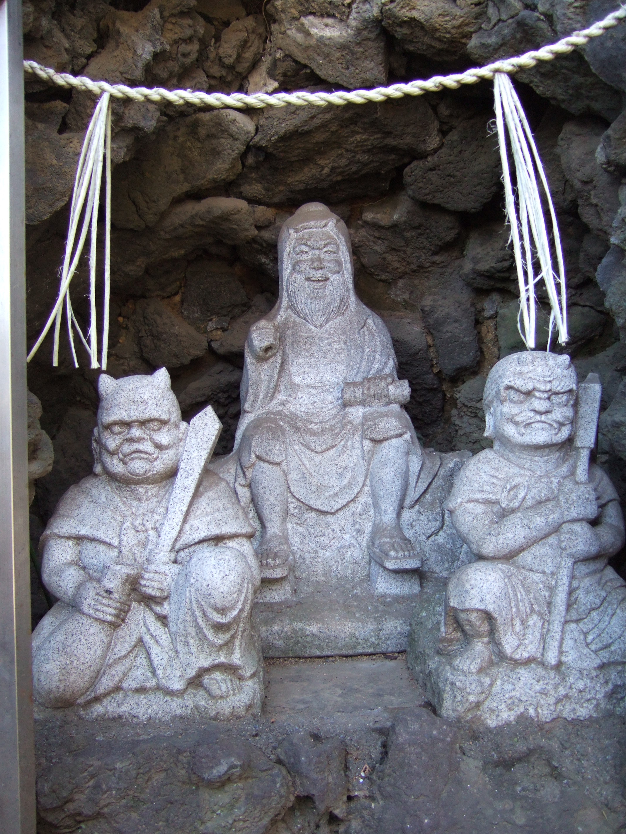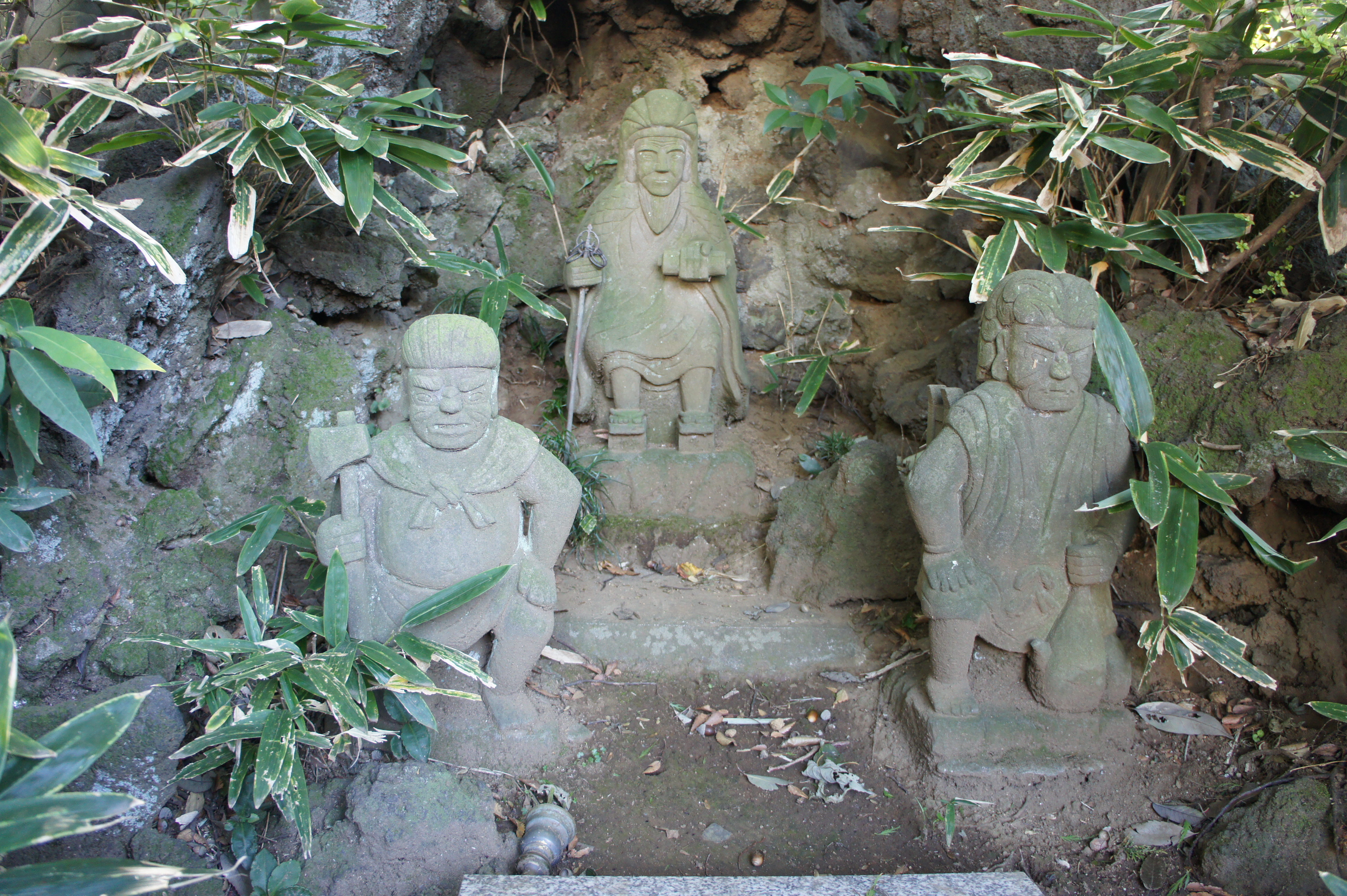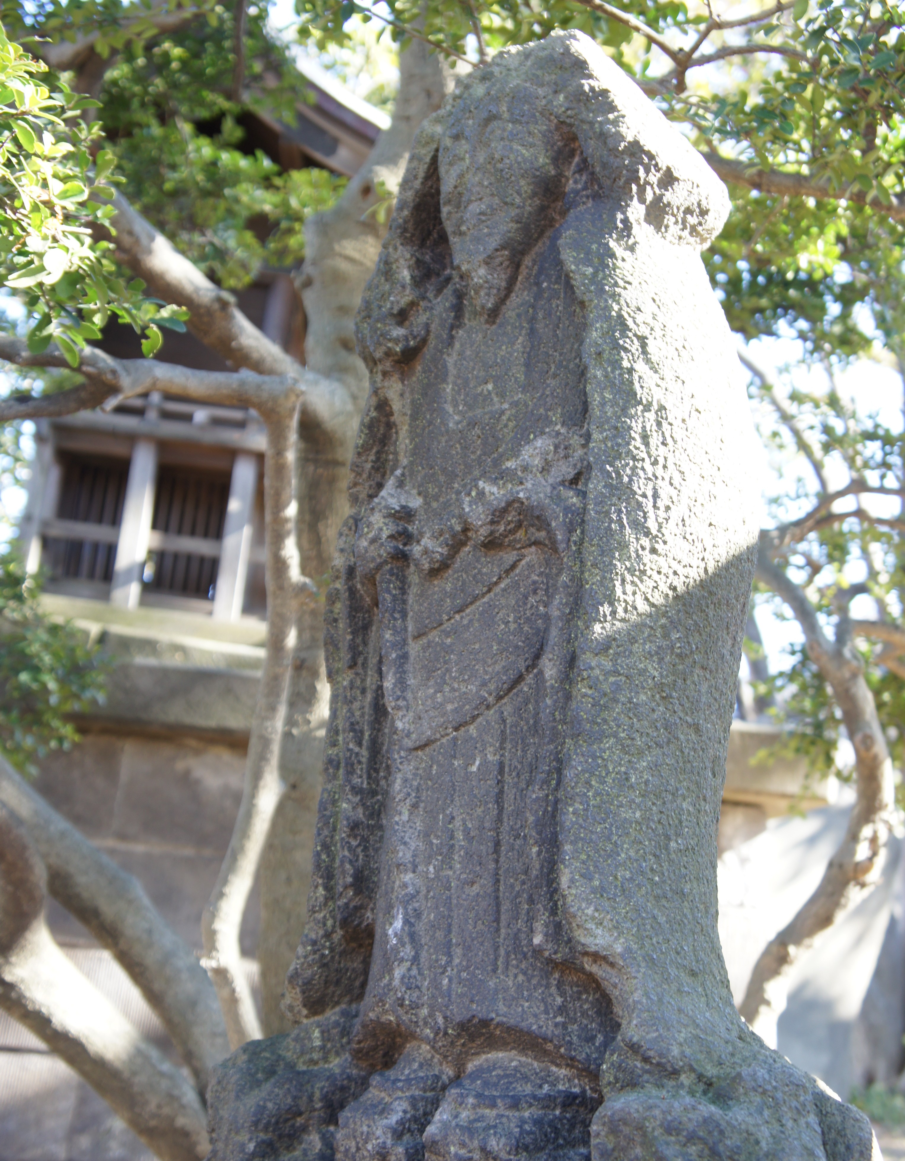 | Ⅰ ひげ地蔵…東京都台東区上野公園2-1。(2011/01) もともと上野公園は、伊勢の津藩上屋敷があったところで、ひげ地蔵は、津藩主藤堂家ゆかりのものだといわれている。 不忍池の弁天島にある弁天堂の右の渡廊下をくぐった右手、茶店・勝亭の右に、石橋でつながった小さな出島(聖天島)がある。鉄柵の扉が閉じられていて、中に入ることができない。正面に小さな社があるが、聖天を祀っているらしい。その左に、男根の形をした役行者の石像の後ろ姿が見える。勝亭から窓越しにやっと横からの石像が望まれるが、やはり詳細は分からない。特徴のある首の部分のくびれを見て取るのが精一杯である。勝亭の人の話では、鉄柵に沿って中に入る人も時に見られるとのことであった。(2006/12、2008/02) 望遠鏡で上野動物園側から見てみたが、樹木が邪魔になって、はっきり見えない。ちょうど鉄柵の中に入る人の姿が見えたので、中に入ってみることにした。 正面の小さな社の左にある役行者の石像を前から見ると、半肉彫り(衣を一体としてみれば丸彫り)で、右手に錫杖、左手に独鈷杵を持った立像であった。乗蓮寺の役行者像と同じ様相をしている。後ろ姿もよく似ている。なぜ後ろ向きなのか。上野東照宮に向かって立っているようだ。あるいは藤堂家の墓所を望んでいるのだろうか。【写真3】 ちなみに役行者の左には、頭部の欠けた、半肉彫りの「青面金剛あるいは歓喜天単身立像?」の石像が祀られている。また社の右には二荒山に関する石碑があり、さらに聖天島の一番右手には、御嶽山と記した石板があって、文久三年(1863)の銘がある。その裏には、天下泰平、国土安穏の銘と般若心経が刻まれている。修験道に関係するものが多いようだ。 上野東照宮(台東区上野公園九番)受付の門前にある台東区教育委員会の説明板には、次のように記されている。 「藤堂高虎(一五五六~一六三〇)は上野山内の屋敷の中に、徳川家康を追慕し、家康を祭神をする宮祠を造った。これが上野東照宮の創建といわれている。あるいは寛永四年(一六二七)、宮祠を造営したのが創建ともいう。もとは『東照社』と称していたが、正保二年(一六四五)に宮号宣下があり、それ以後家康を祀る神社を東照宮と呼ぶようになった。/現在の社殿は、慶安四年(一六五一)、三代将軍家光が大規模に作り替えたもので、数度の修理を経ているが、ほぼ当初の姿を今に伝える。……」 さらに東照宮本殿に向かう参道にある「東照宮略記」の説明板には、祭神を「徳川家康・徳川吉宗・徳川慶喜」と記したうえで、縁起について次のように記している。 「元和二年二月見舞いのため駿府城にいた藤堂高虎と天海僧正は危篤の家康公の病床に招かれ三人一処に末永く魂鎮まるところを造って欲しいと遺言されたそこで高虎の屋敷地であるこの上野の山に寛永四年(一六二七)に本宮を造営したその後家光はこの建物に満足出来ず慶安四年現在の社殿を造営替えし、江戸の象徴とした」 |