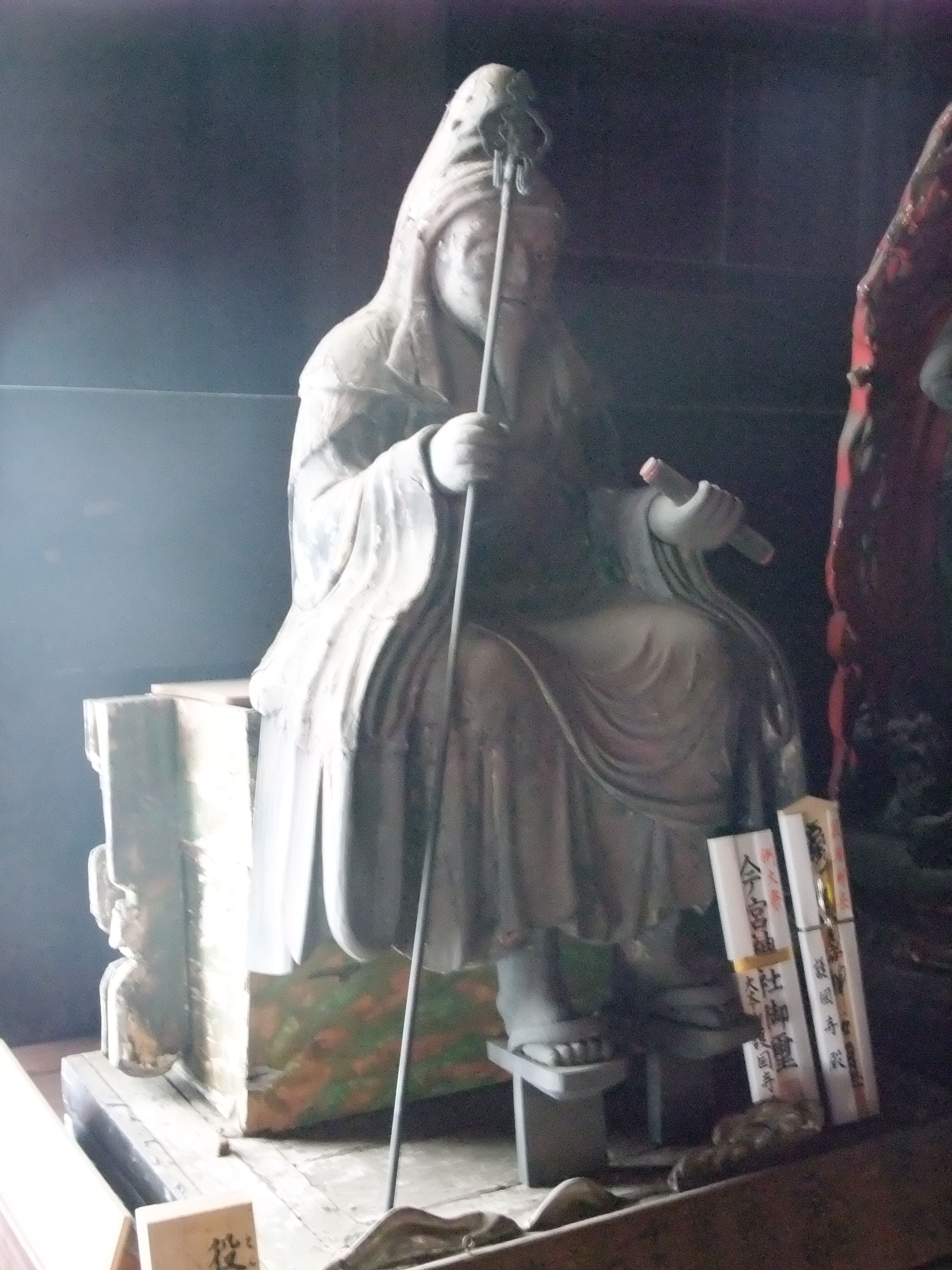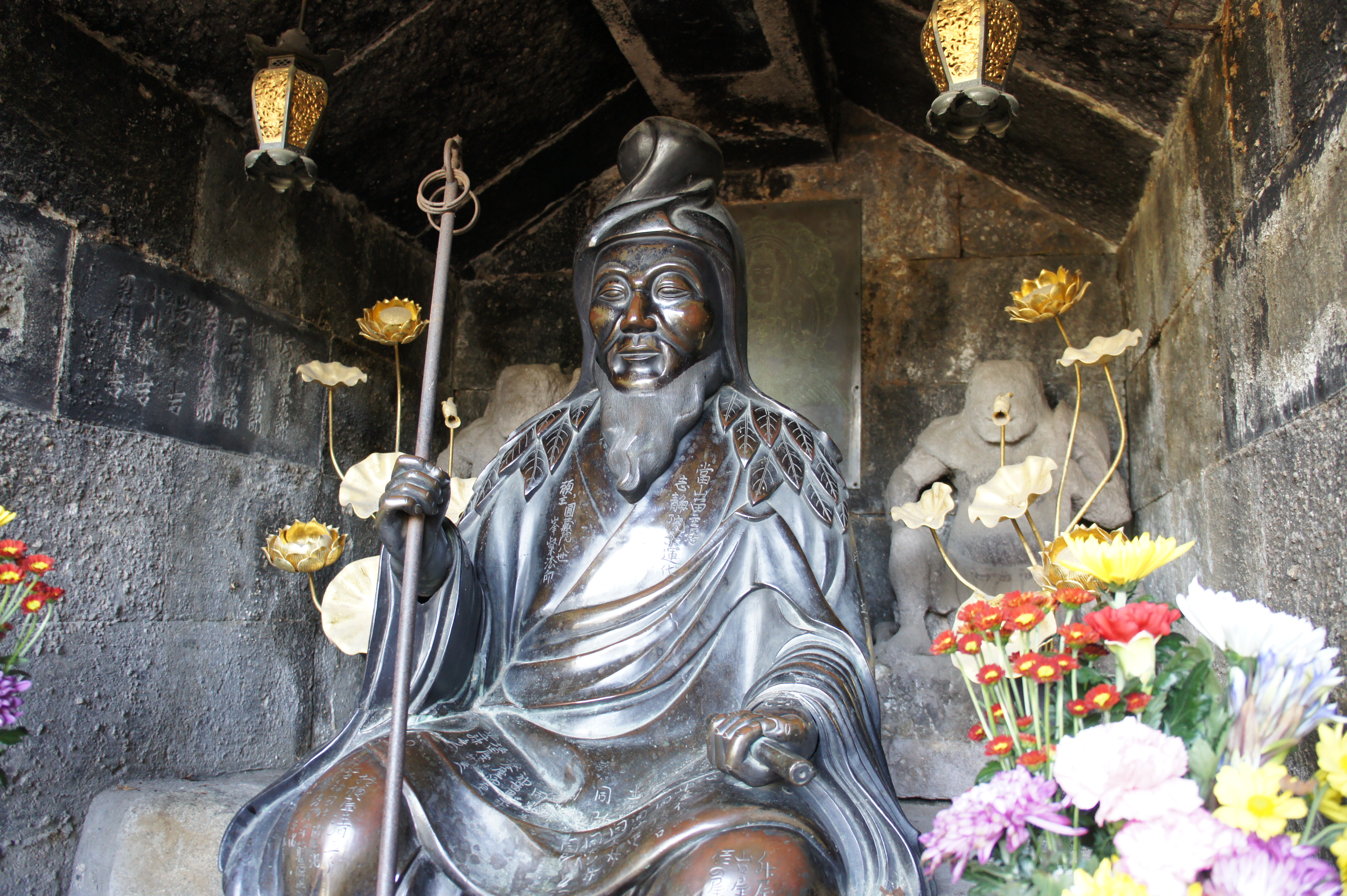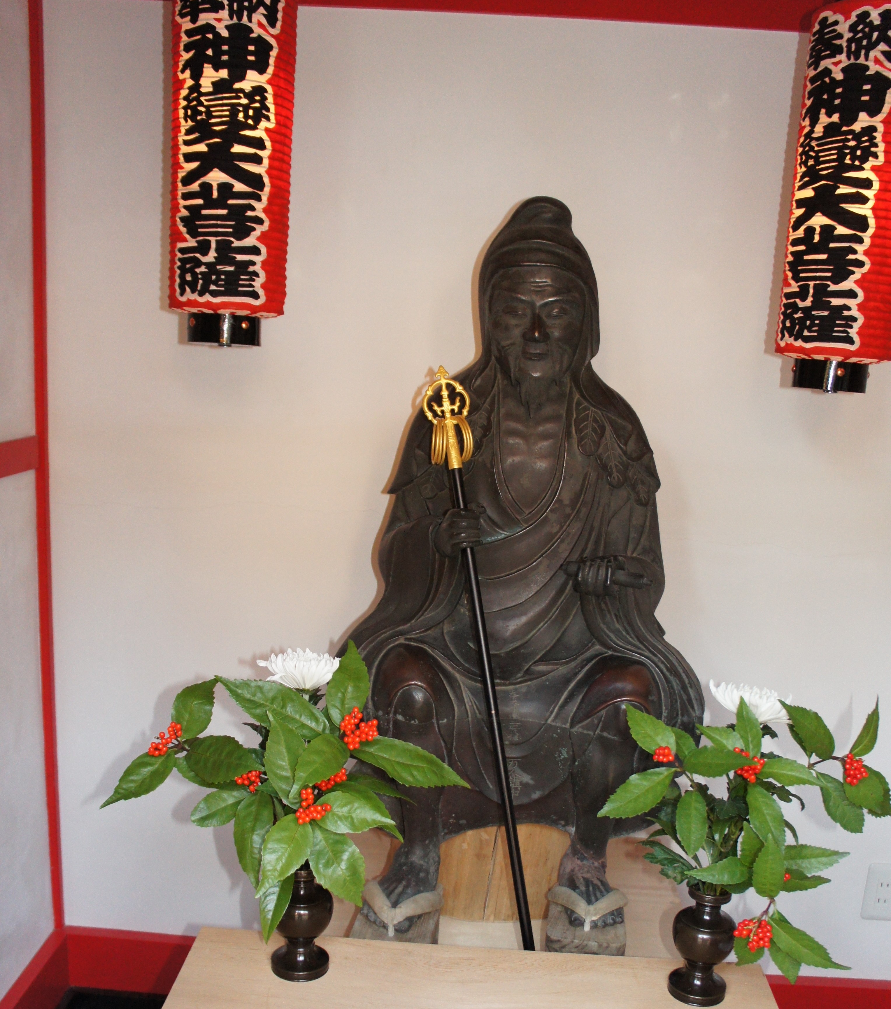 | 威盛院光松山放生寺…東京都新宿区西早稲田2-1-14。(2011/01) 高野山真言宗準別格本山。本尊は聖観世音菩薩。虫封じのお寺。 境内の「當山由緒沿革」には、次のように記されている。 「放生寺は寛永十八年(一六四一年)威盛院権大僧都法印良昌上人が高田八幡(穴八幡宮)の造営に尽力され、その別当寺として開創されたお寺です。……/開創当寺から明治までは、神仏習合により穴八幡別当放生寺として寺と神社は同じ境内地にあり、代々の住職が社僧として寺社一山の法務を司っておりましたが、明治二年、當山十六世実行上人の代、廃仏毀釈の布告に依り、境内を分割し現今の地に本尊聖観世音菩薩が遷されました。/このように當山は、徳川家由来の観音霊場として広く知られ殊に本尊聖観世音菩薩は融通虫封観世音と称され、御府内八十八ヶ所霊場第三十番札所、江戸三十三観世音第十五番札所として多くの人々の尊信を集めております。」 本堂正面の祠に役行者の石像が祀られているというが、見ることができなかった。聞けば、本堂の向かいに建立工事中のお堂が行者堂で、役行者像もそこに祀られるとのことであった。南無神変大菩薩と謹書し、中にぞうりが入っているお守りを授与しており、また絵馬もあって、足腰によいとされている。(2010/11) 坂東玉三郎の公演を見るため上京したついでに、再び放生寺に立ち寄った。神変大菩薩を祀った行者堂が完成していた。役行者は、等身大の青銅像で、右手に錫杖、左手に経巻を持った半眼の倚像である。【写真1】 |